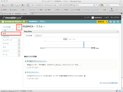 1. 下図の赤枠を参照に、ブログ記事の横の▼ > 新規を選択します。