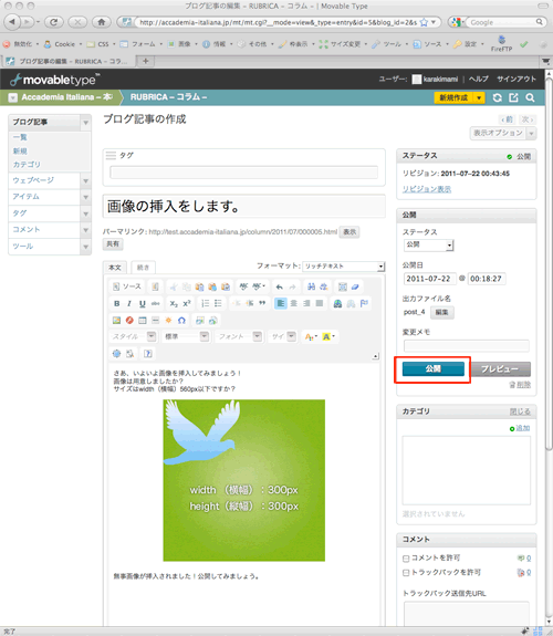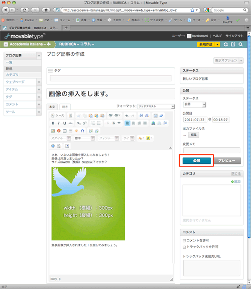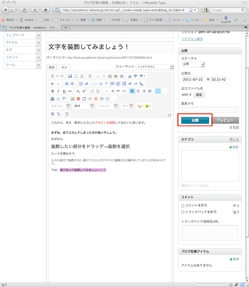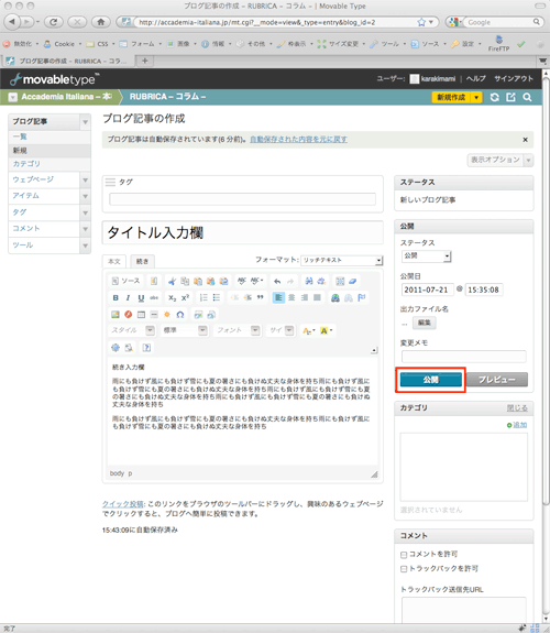 4. 記事の入力が終わったら、右下の公開ボタンをクリックします。