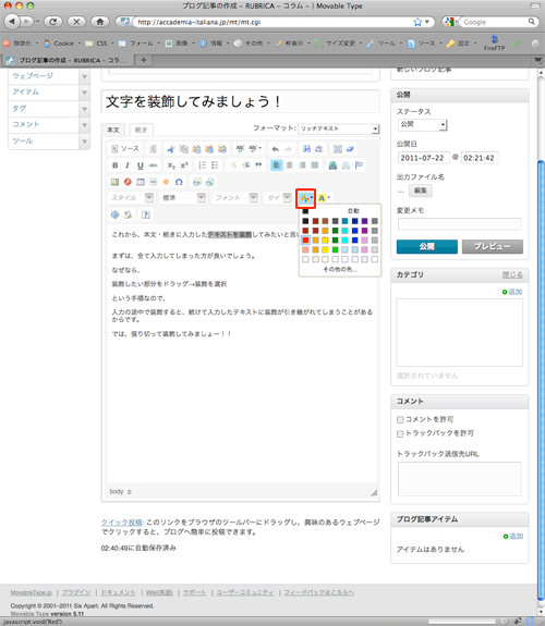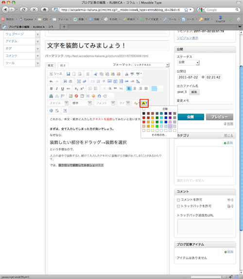 お好みの色をクリックします。(見本では赤をクリックしました。)