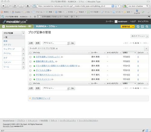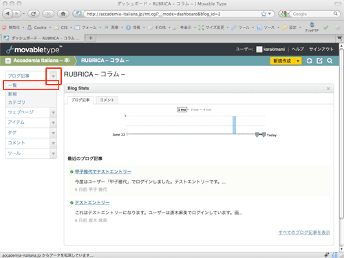 - 下図の赤枠を参照に、ブログ記事 > 一覧を選択します。